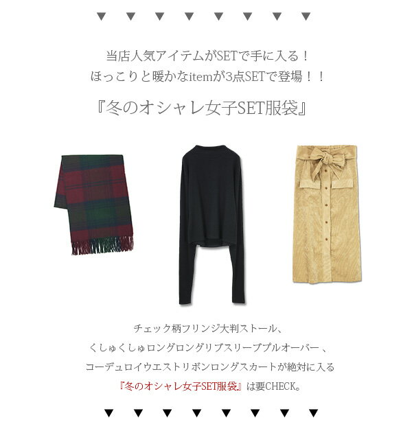 商品の特徴 ■当店人気アイテムがSETで手に入る!ストール&カットソー&ロングスカートが入った冬のおしゃれ女子SET福袋が登場!! チェック柄フリンジ大判ストール、くしゅくしゅロングロングリブスリーブプルオーバー 、コーデュロイウエストリボンロングスカートの3点が絶対入るお得なSET福袋になります。
